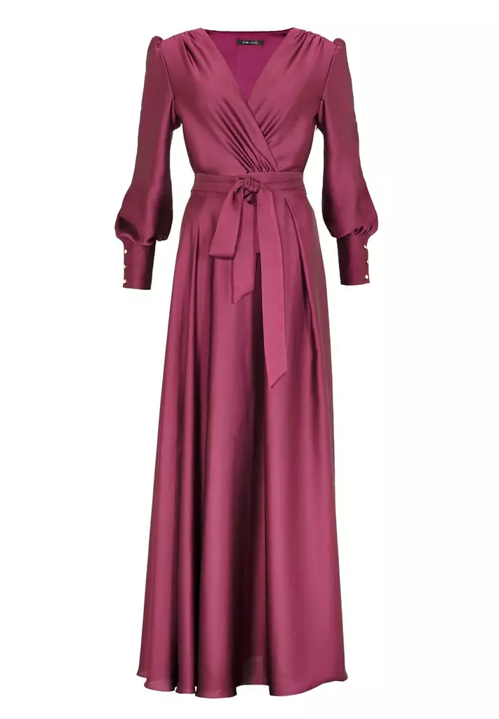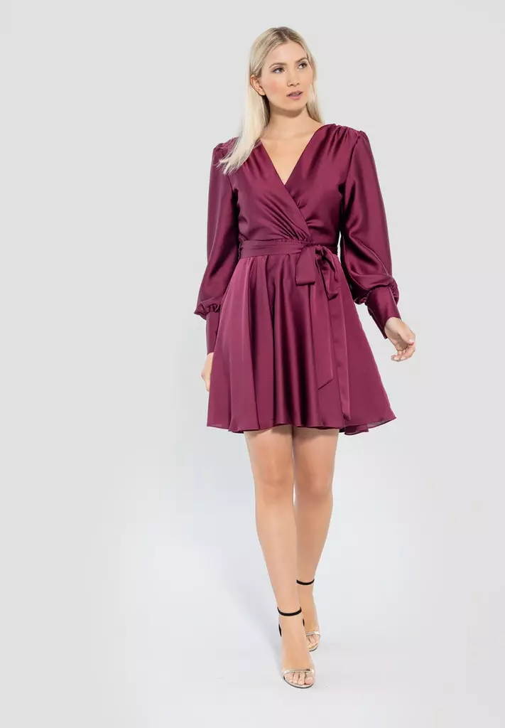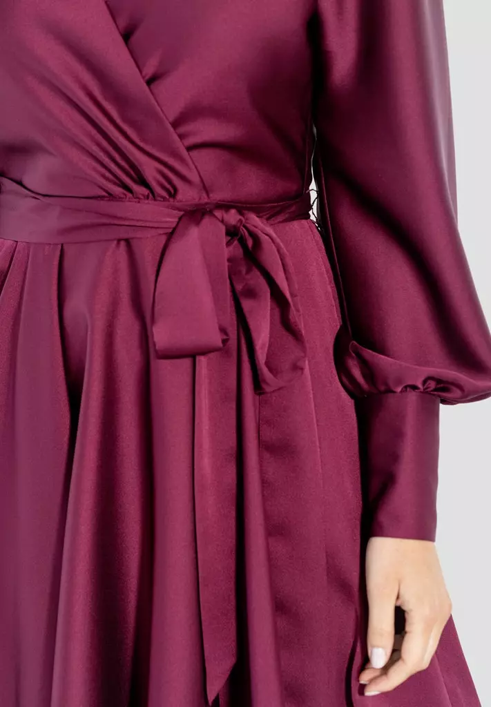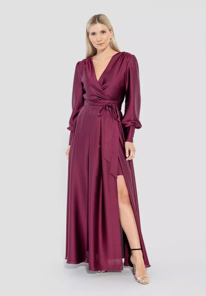 Niet één, maar twee jurken in 1! Hoe stoer is dat? Je start de dag met een prachtige maxi jurk en in de avond of warmere uren wikkel je het rokgedeelte af en heb je een cocktail jurk. Deze satijn look jurk heeft lange mouwen en een v-hals. De jurk is voorzien van een rits aan de zijkant en de rok kun je gemakkelijk om en afwikkelen naar wens.