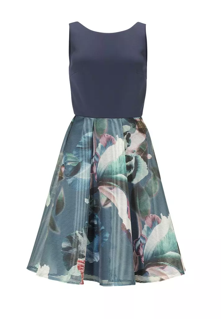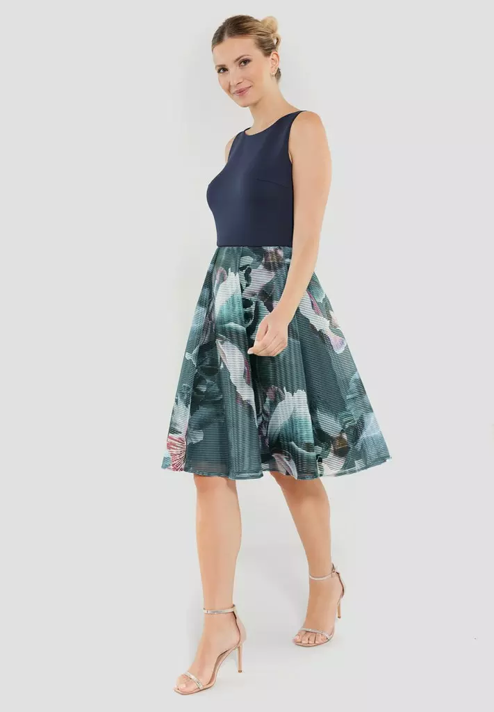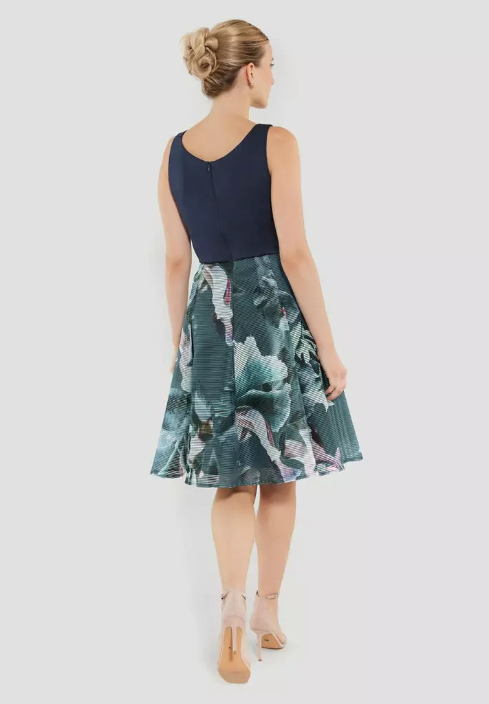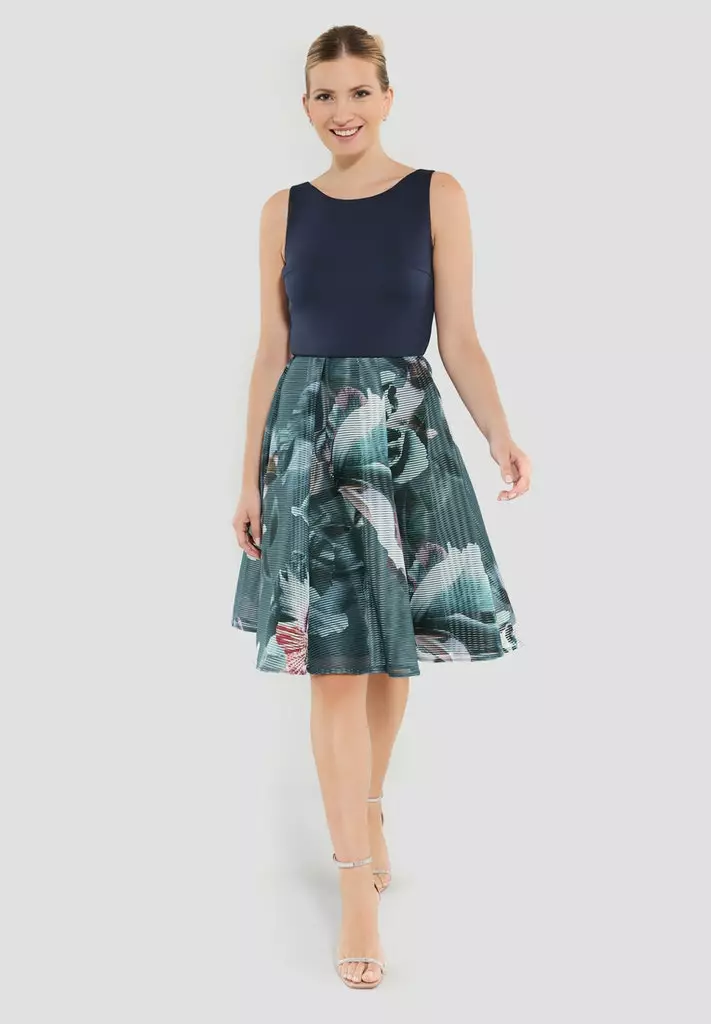 Cocktailjurk met 3D print door de prachtige rok. Het bovenstuk is van jersey kwaliteit en zit aangesloten op je lijf. De jurk valt rondom de knie, is mouwloos en heeft een ritssluiting aan de achterzijde.