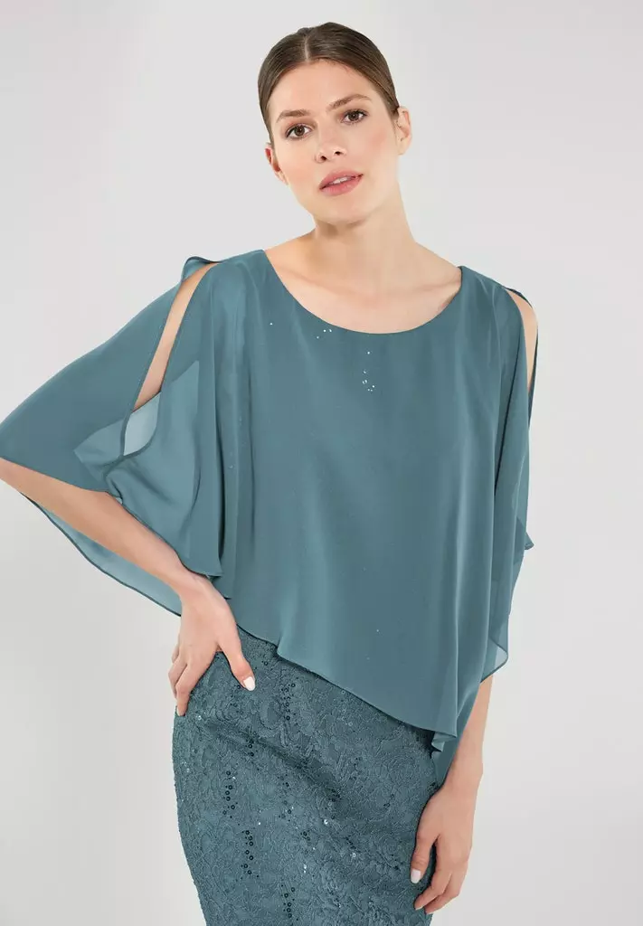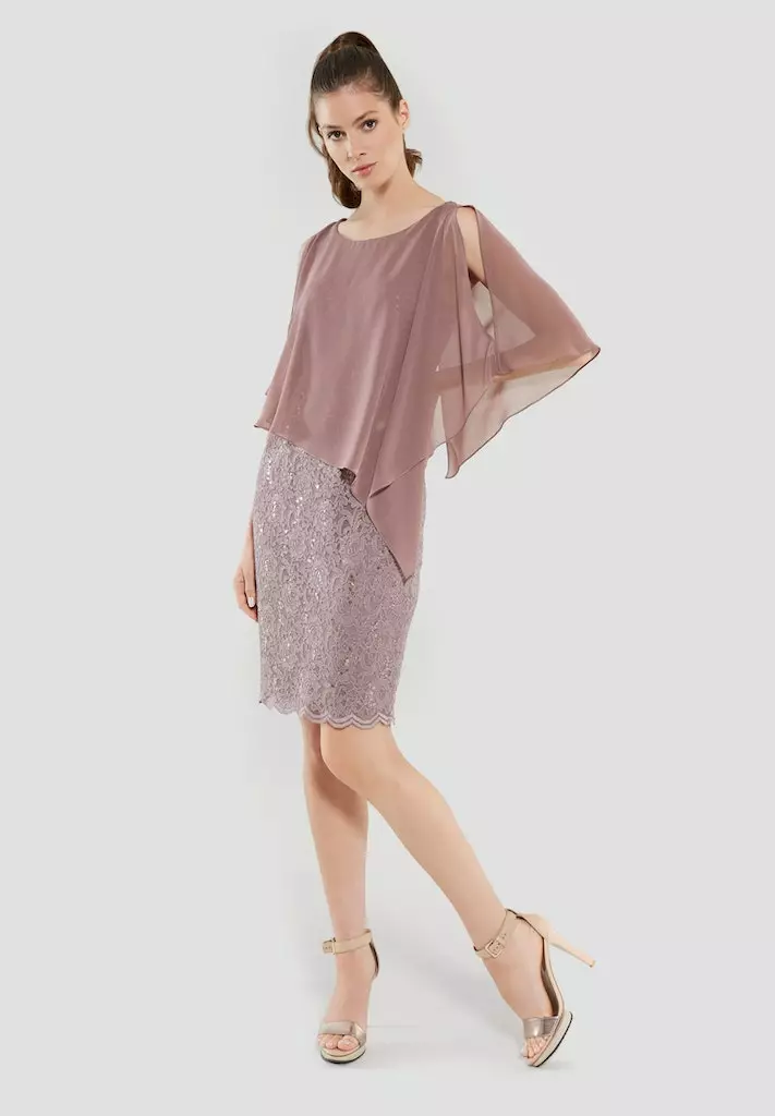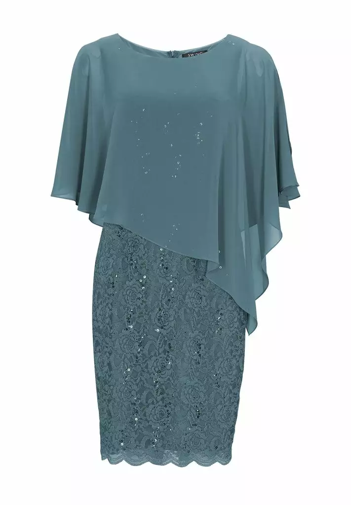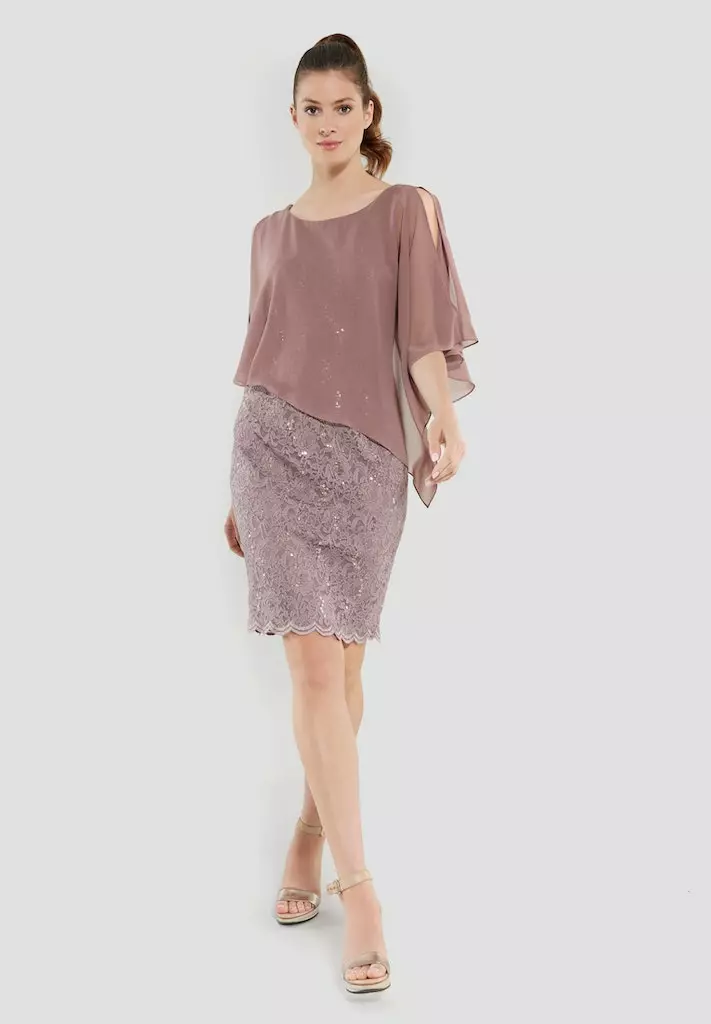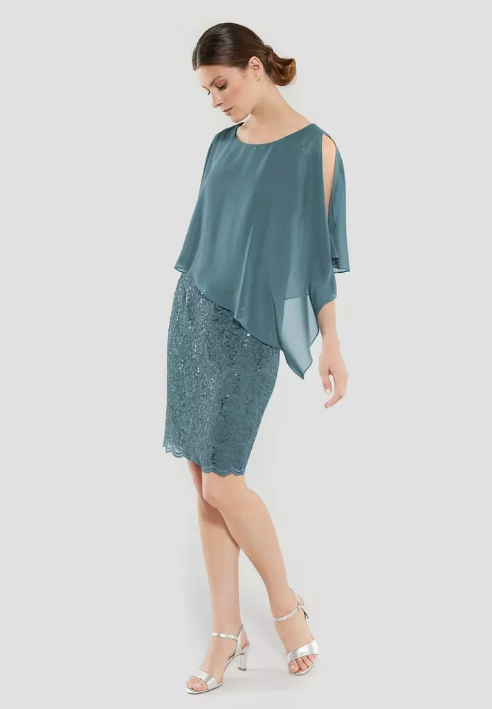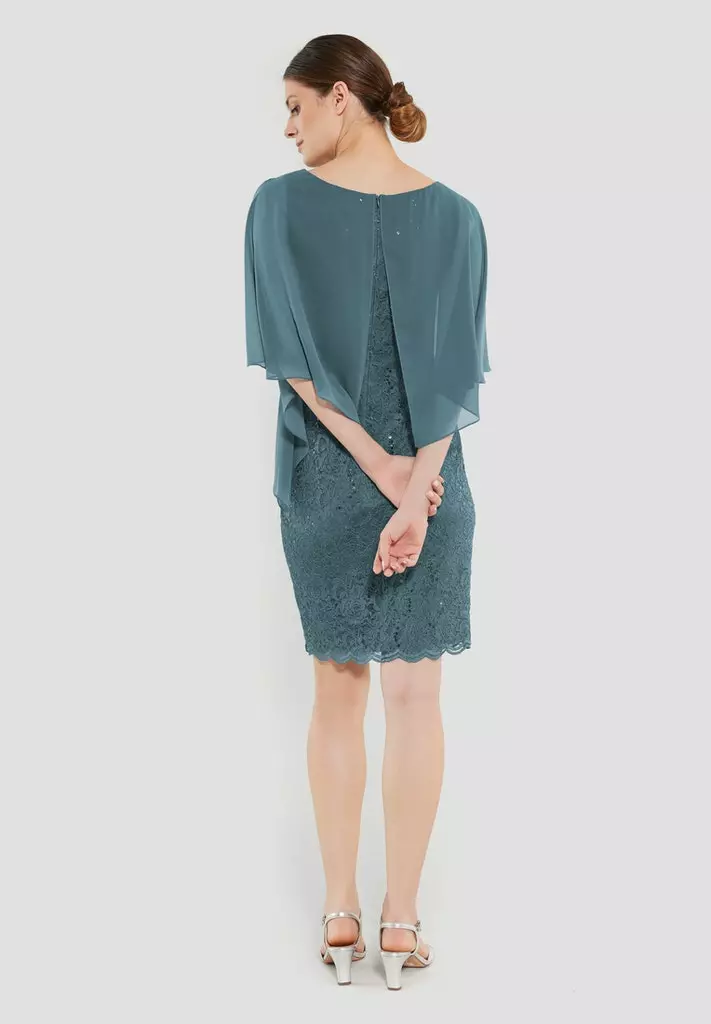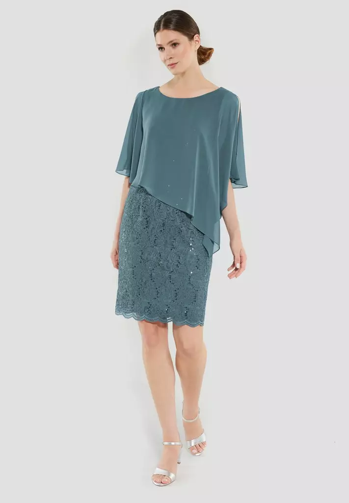 Kanten jurk met een voile doek dat er zwierig overheen valt. De jurk rekt goed mee op je figuur en valt tot rondom de knie.