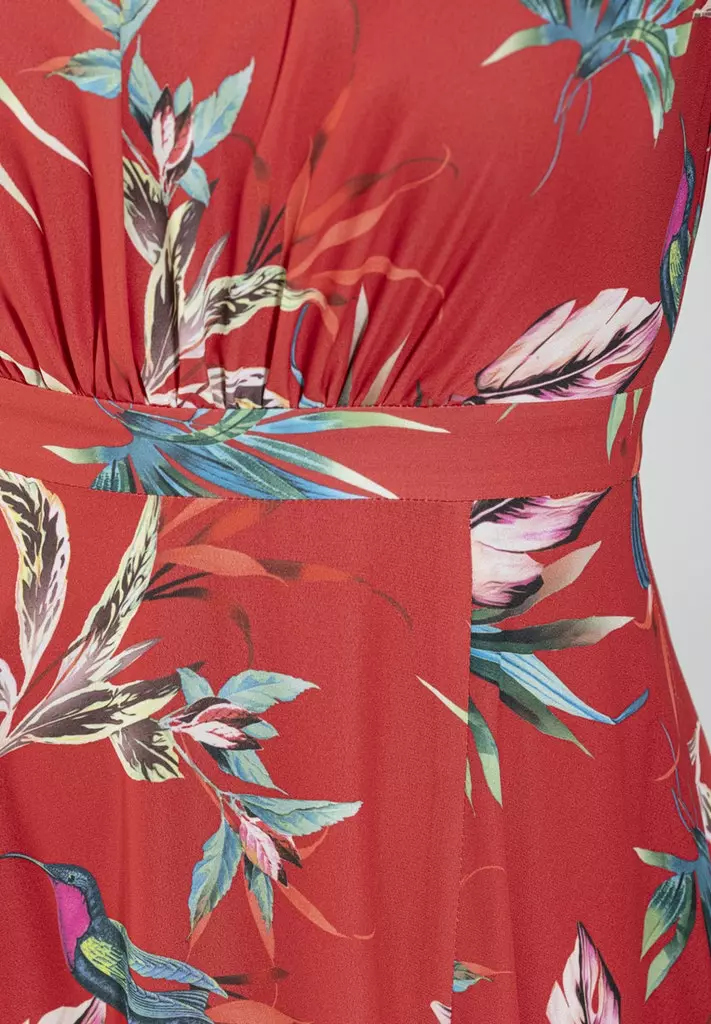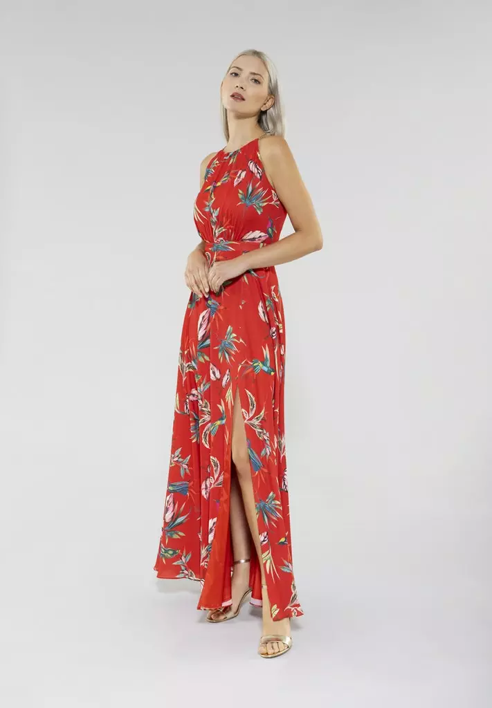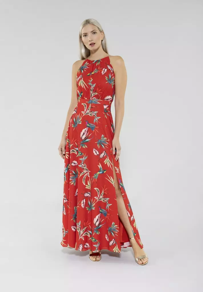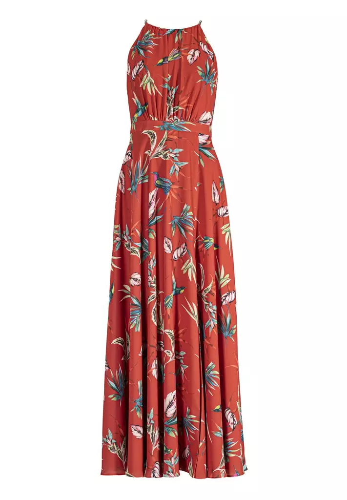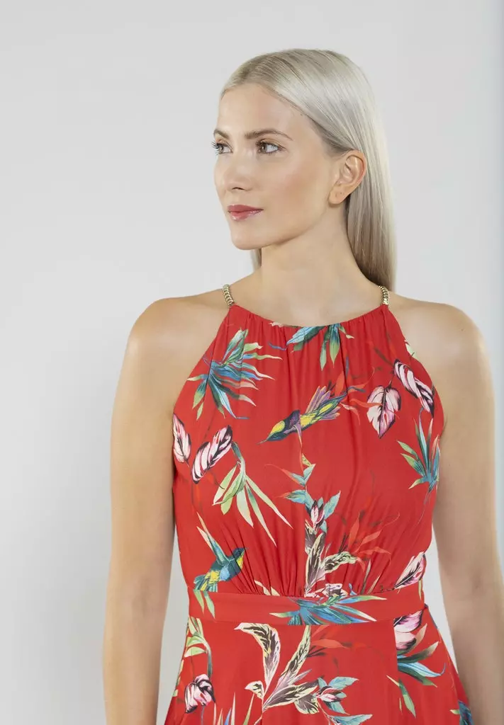 Een model dat vaker in de de SWING collectie te vinden is endat altijd goed in de smaak valt! Maxi jurk met prachtige hals, getailleerd in de taille en vanuit daar een zwierige rok. Met deze jurk straal jij op ieder feest of op een mooie zomerdag!