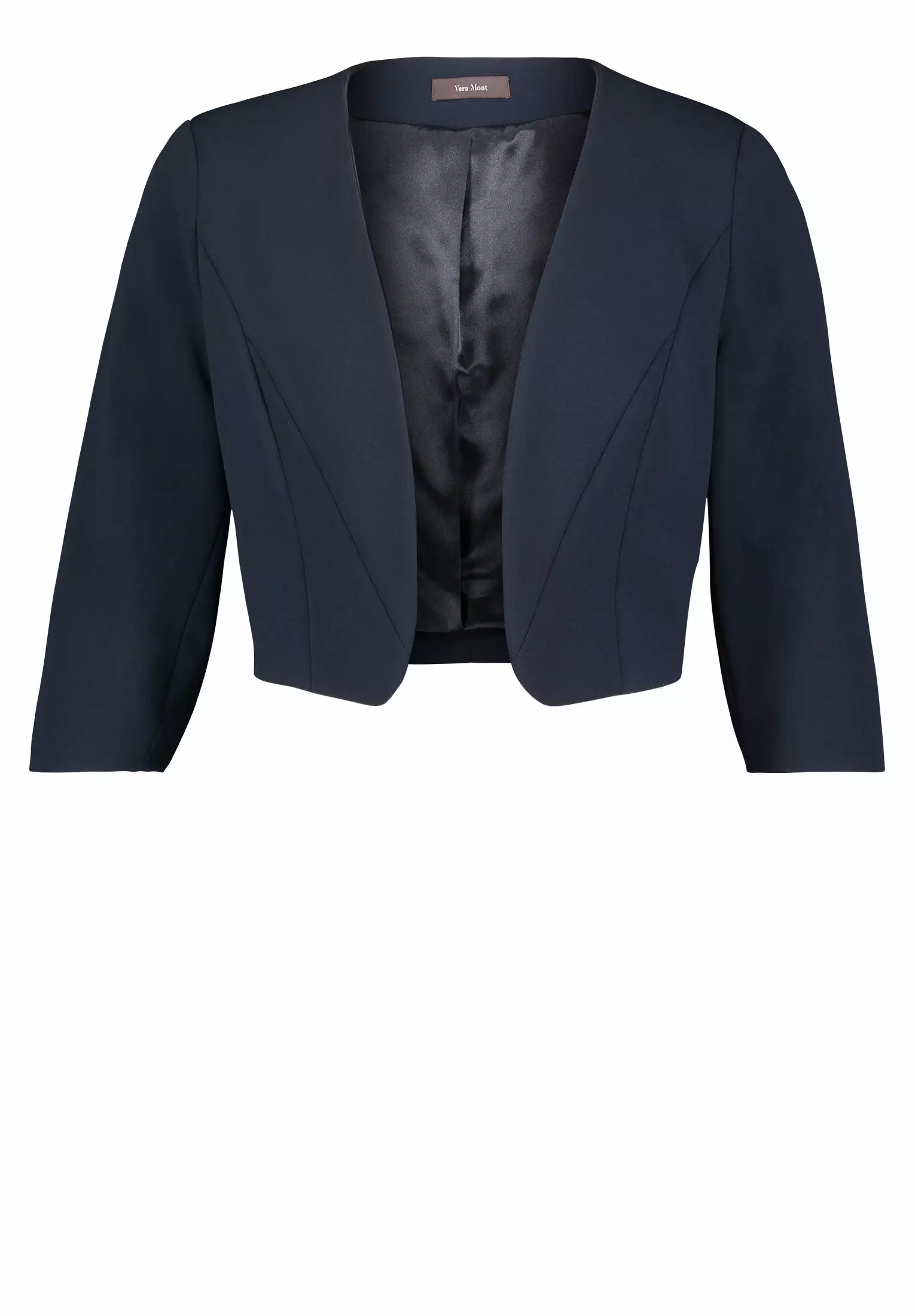 Deze bolero blazer is gemaakt van een crepe kwaliteit en heeft dus geen glans. Doordat het model kort is valt deze perfect op de jurk en valt hij mooi in je taille.