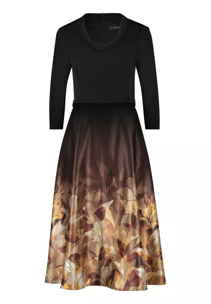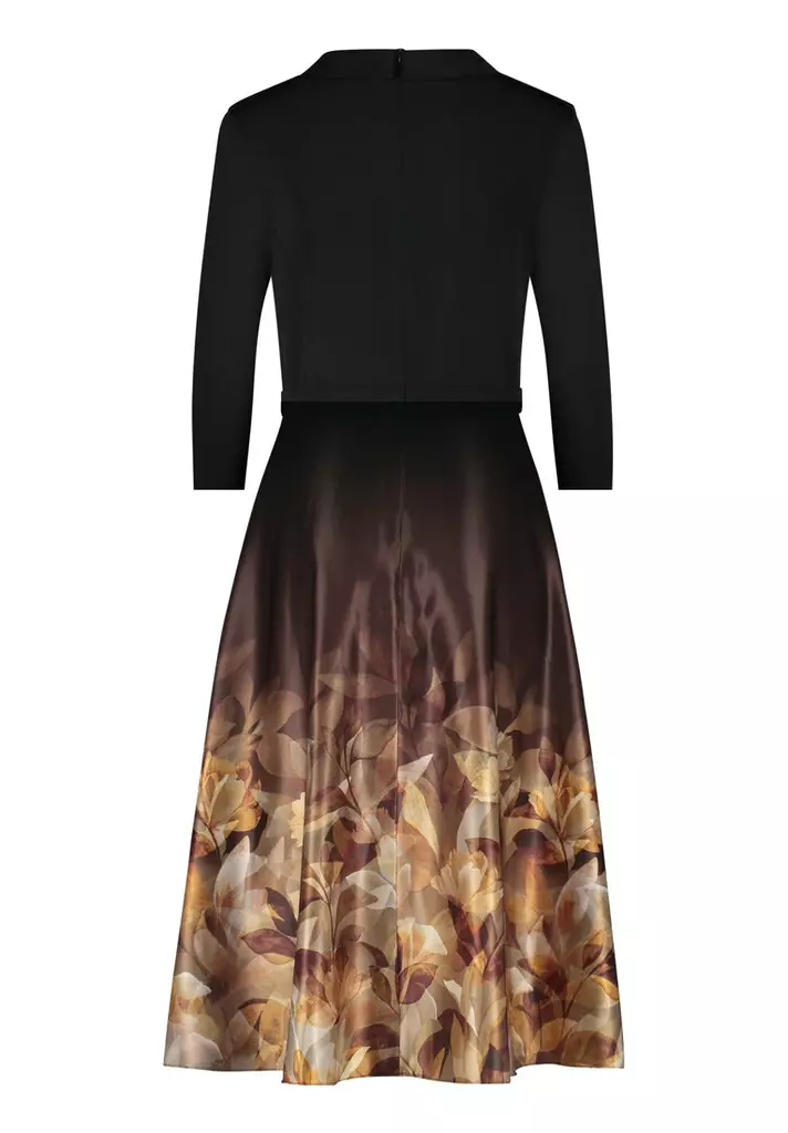 A-lijn jurk met prachtige print in verschillende goud/bruin tinten. De jurk heeft een turtle kraagje, drie kwart mouwen en valt op een midi lengte. Verder heeft de jurk een ritssluiting.