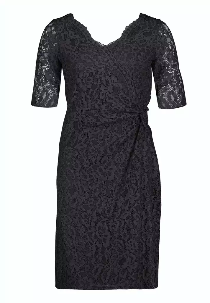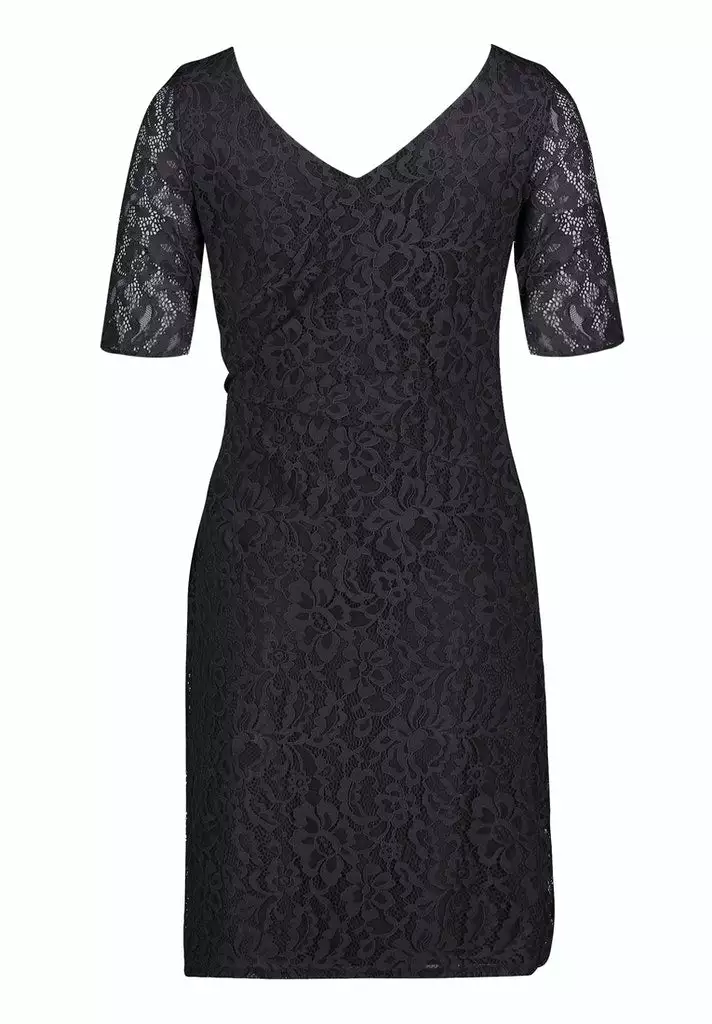 Aansluitende cocktailjurk van kant dat goed meerekt waardoor deze mooi aansluit op het figuur en tevens lekker draagt. De jurk heeft een v-hals zowel aan de voor als achterzijde, korte mouw en een mooie plooi in de zijkant. De jurk heeft verder een ritssluiting en valt rondom de knie.