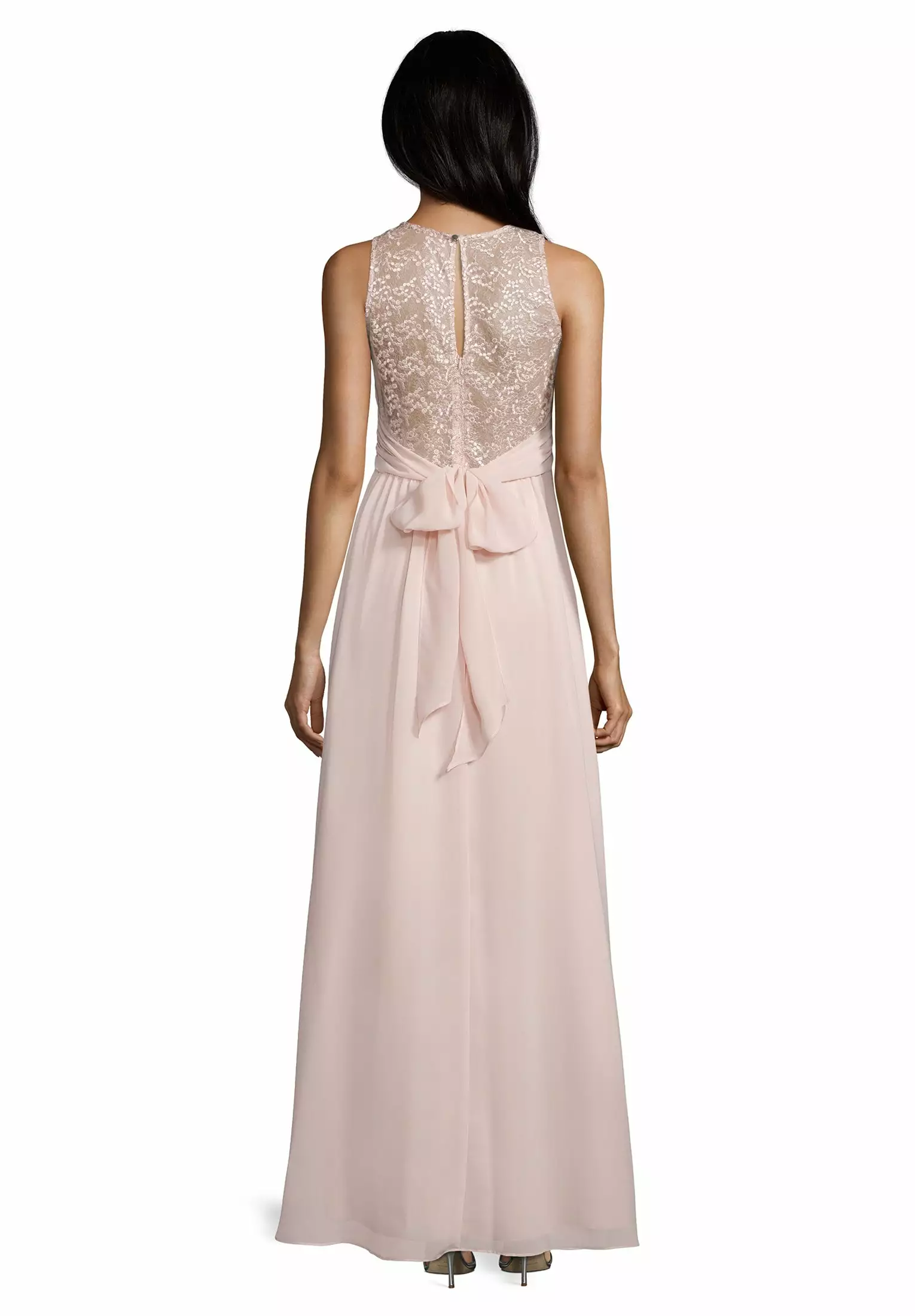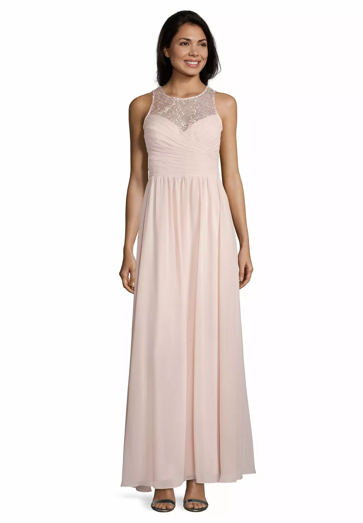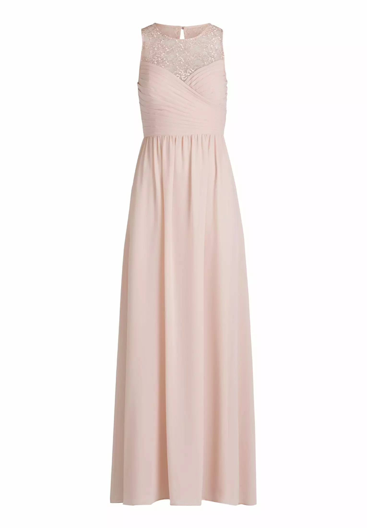 Zeer elegante maxi avondjurk waarbij het top gedeelte op de borst geplisseerd valt en de hals en rug voorzien is van mooi doorzichtig stof. Op de achterzijde strik je de jurk.