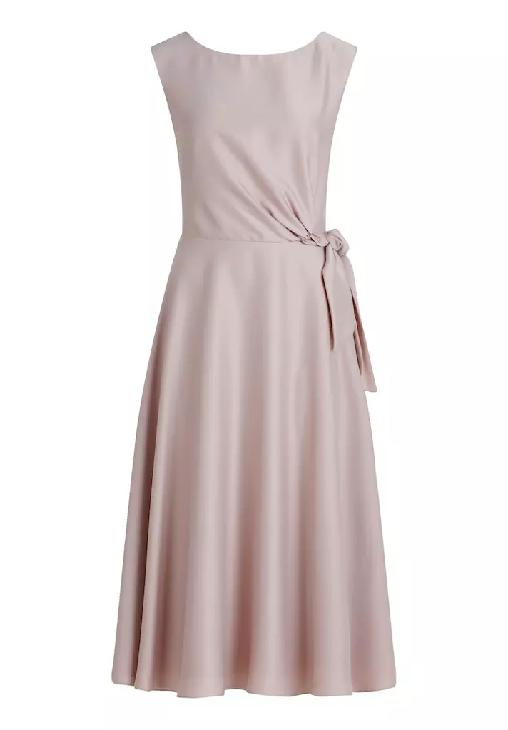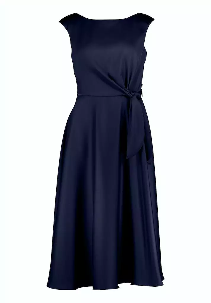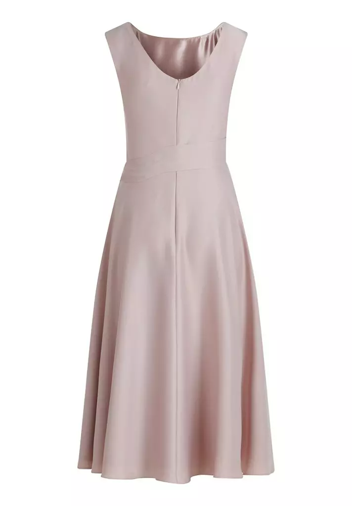 Satijnen midi jurk met ronde halslijn. Deze jurk valt mooi getailleerd in de top en loopt dan uit in een a-lijn.