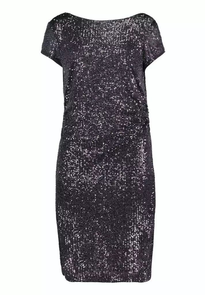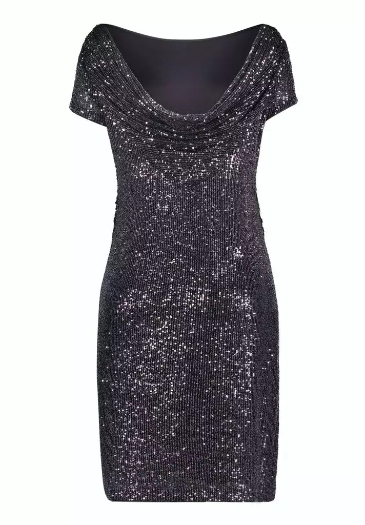 Prachtige cocktailjurk met pailetten en watervallijn op de rug. De jurk valt rondom de knie en heeft een korte mouw. De jurk rekt door de elastaan waardoor deze lekker zit en mooi aansluit op je figuur.