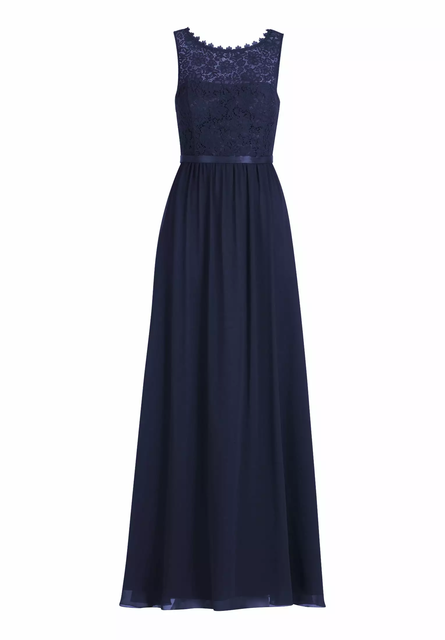 Avondjurk met ritssluiting aan de achterzijde. Het bovenstuk is voorzien van kant en een satijnen tailleband.