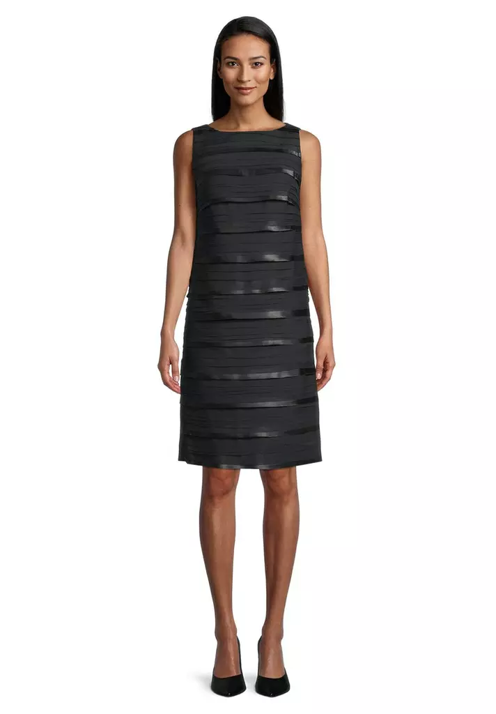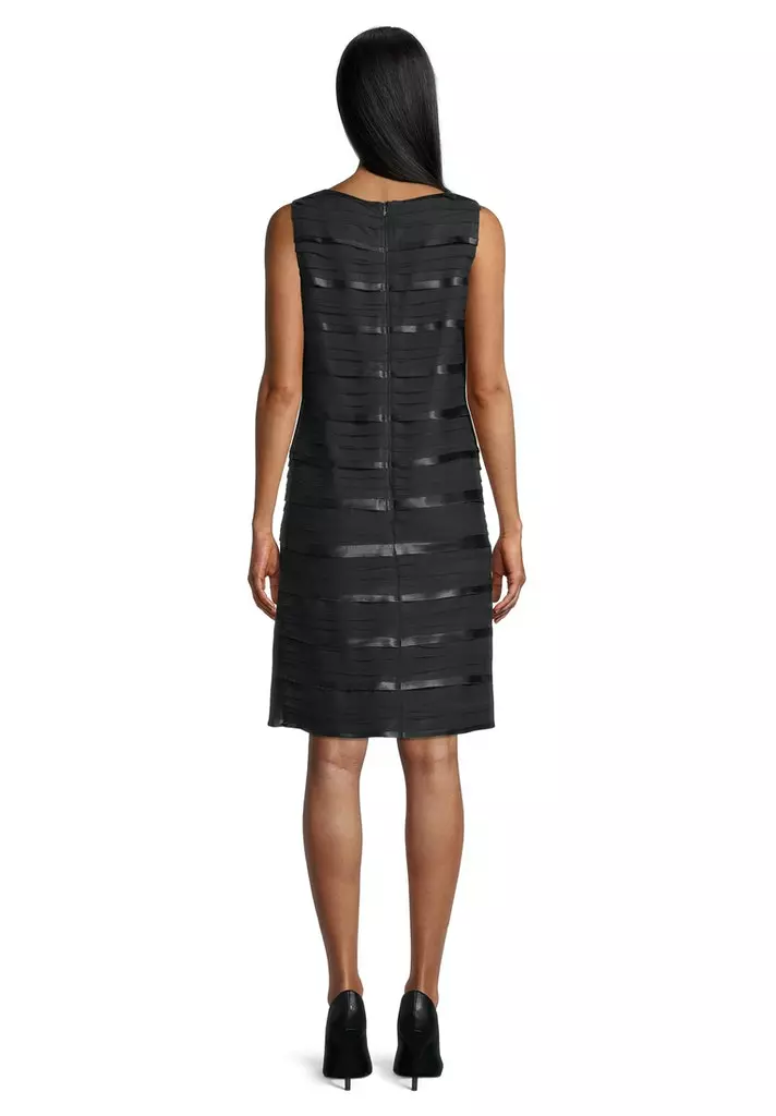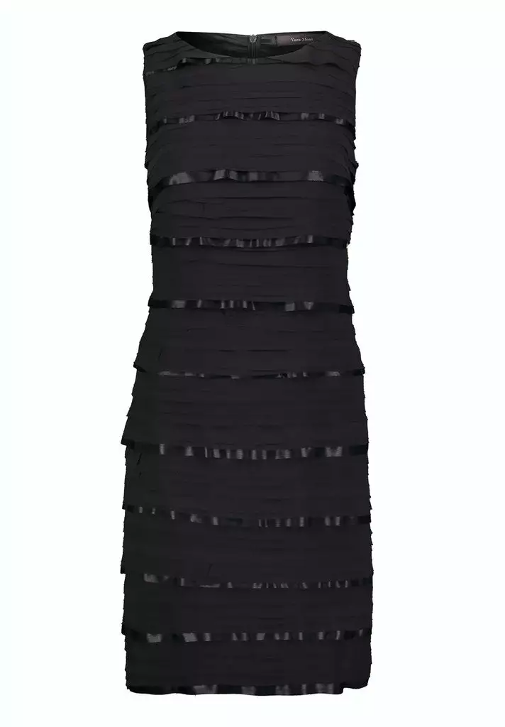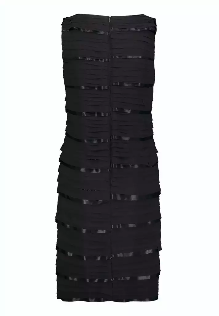 Classy black dress. Deze jurk bestaat uit laagjes die over elkaar heen vallen als schubben. De jurkheeft een ronde hals, is mouwloos en valt rondom de knie. De jurk heeft een ritssluiting aan de achterzijde.
