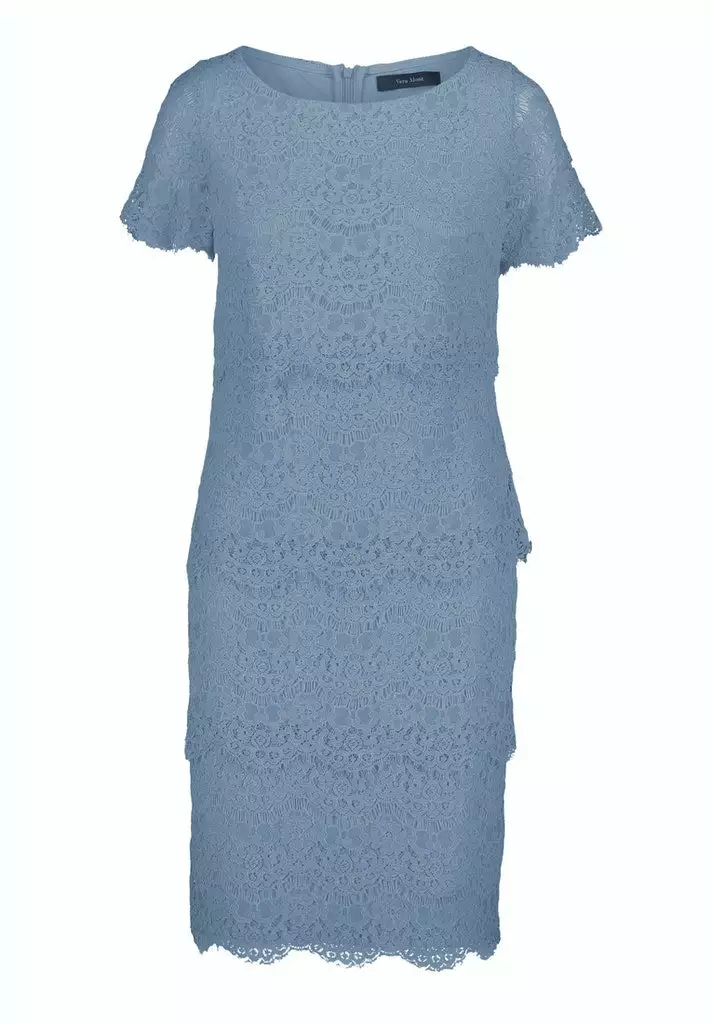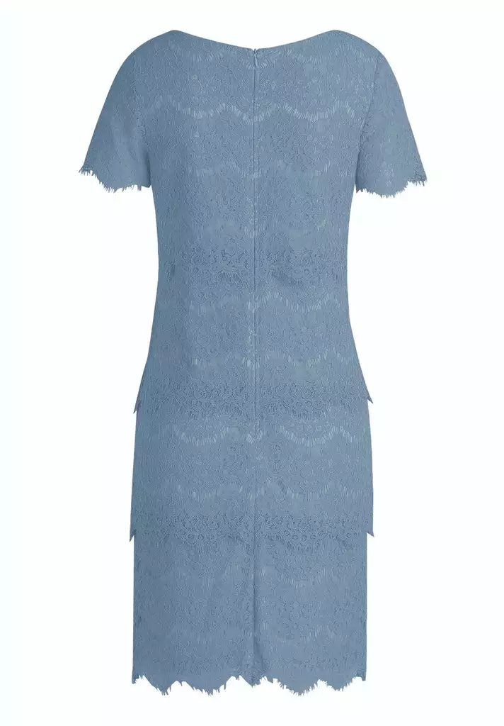 De kanten jurk rekt fijn mee en door de laagjes die over elkaar heen vallen is deze jurk perfect om je buikje te verhullen! De jurk heeft een korte mouw, ronde halslijn en valt iets onder de knie.Verder heeft de jurk een ritssluiting aan de achterzijde.