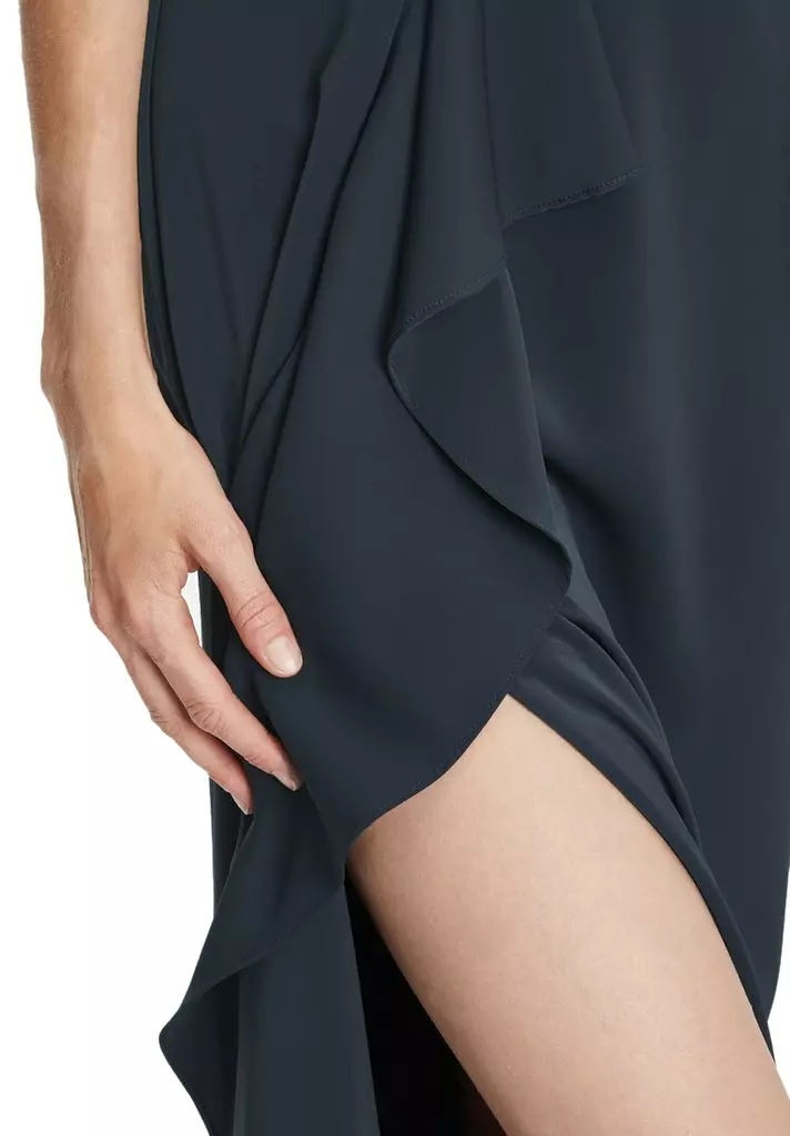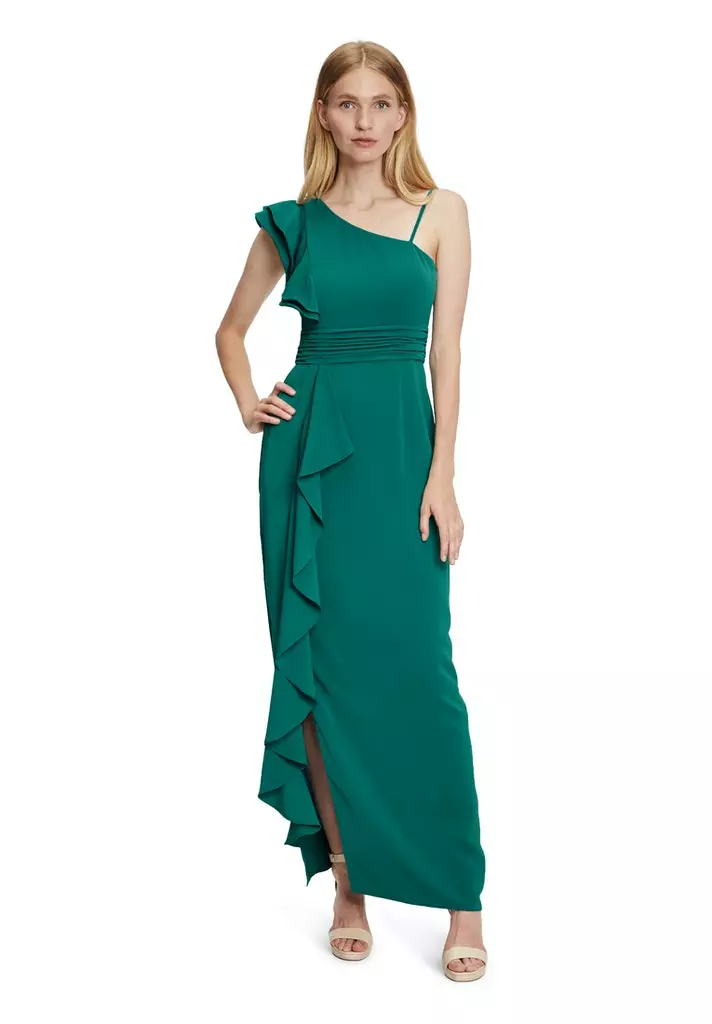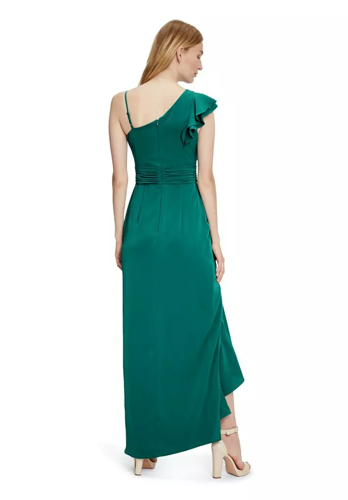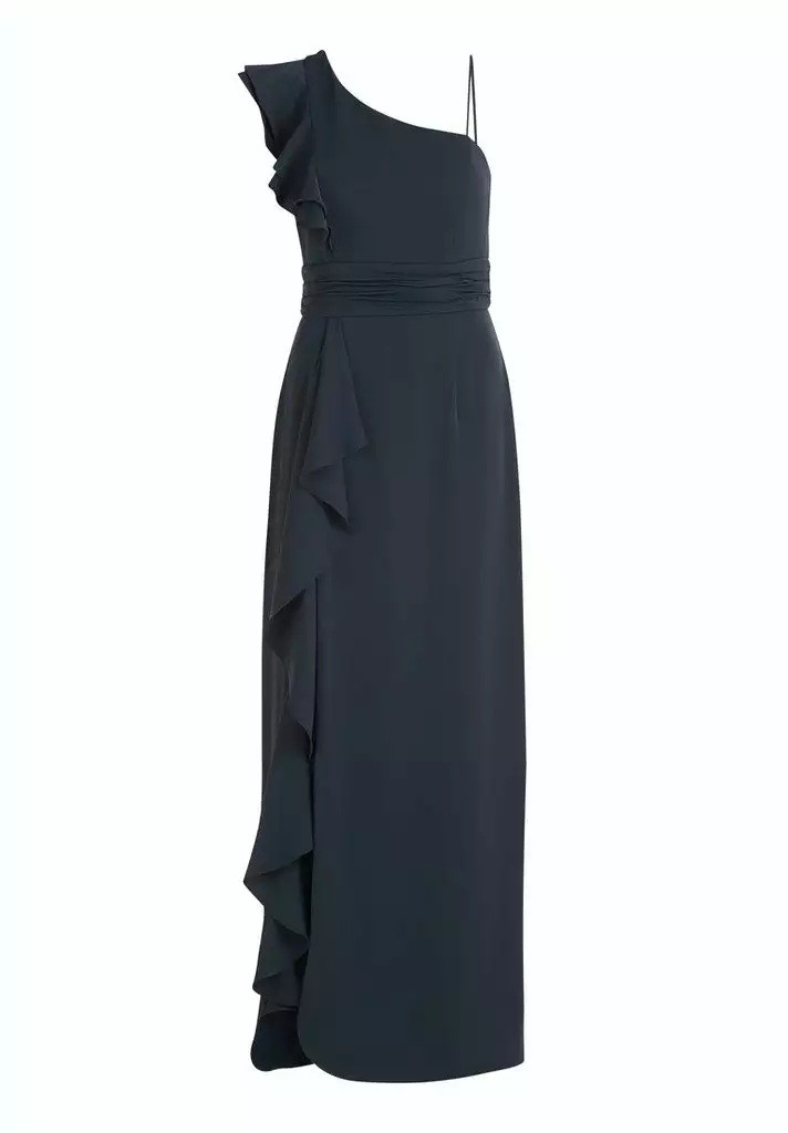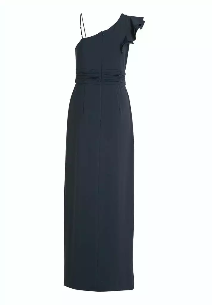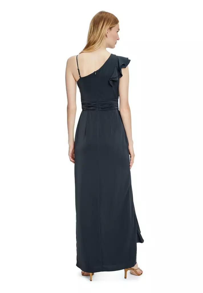 Prachtige avondjurk met ruffles aan de zijkant. Een asymetrische mouw,getailleerde taille en de split maken deze jurk tot een absolute parel!