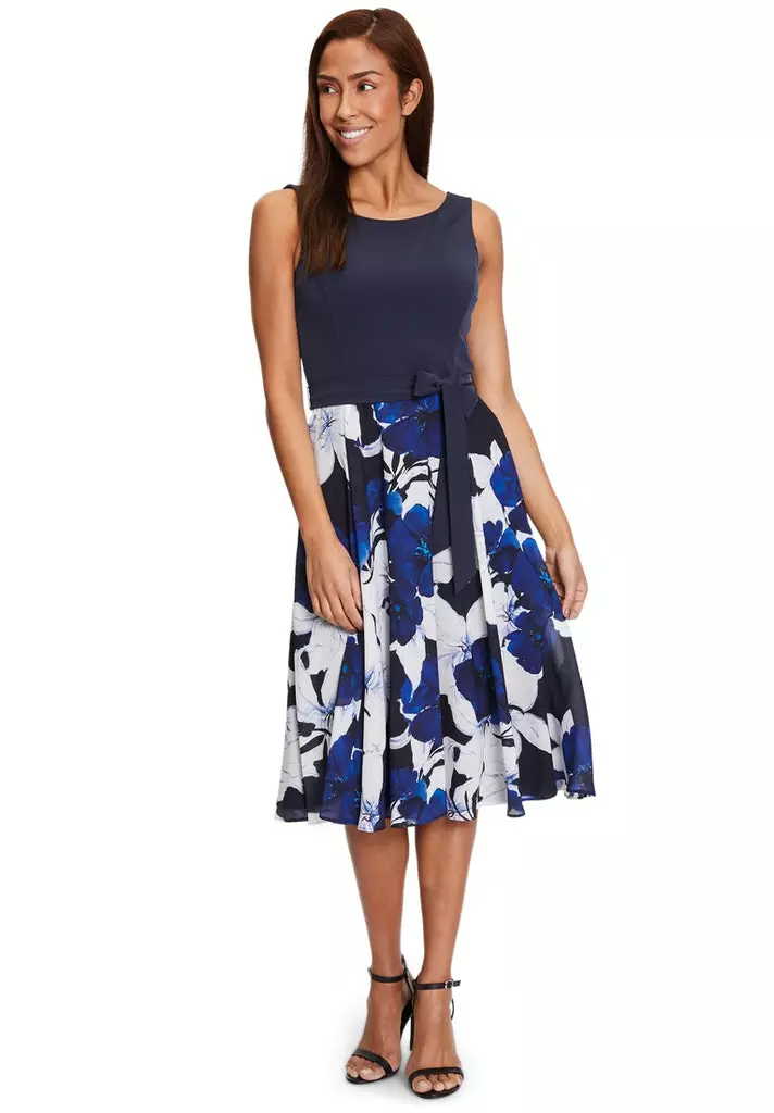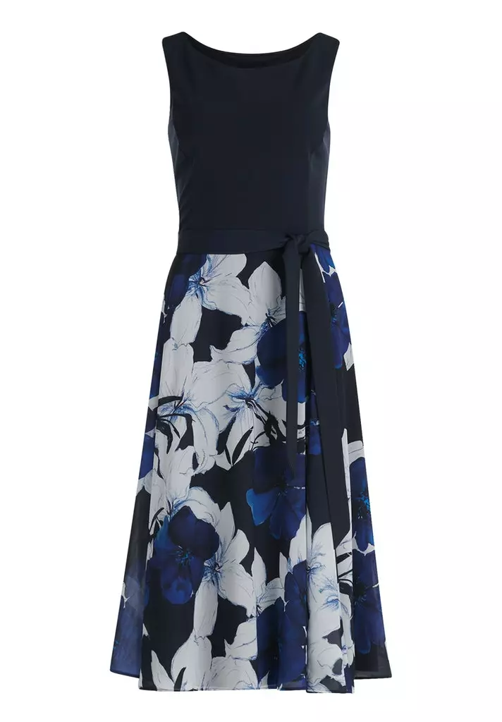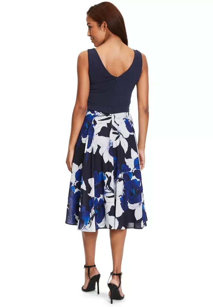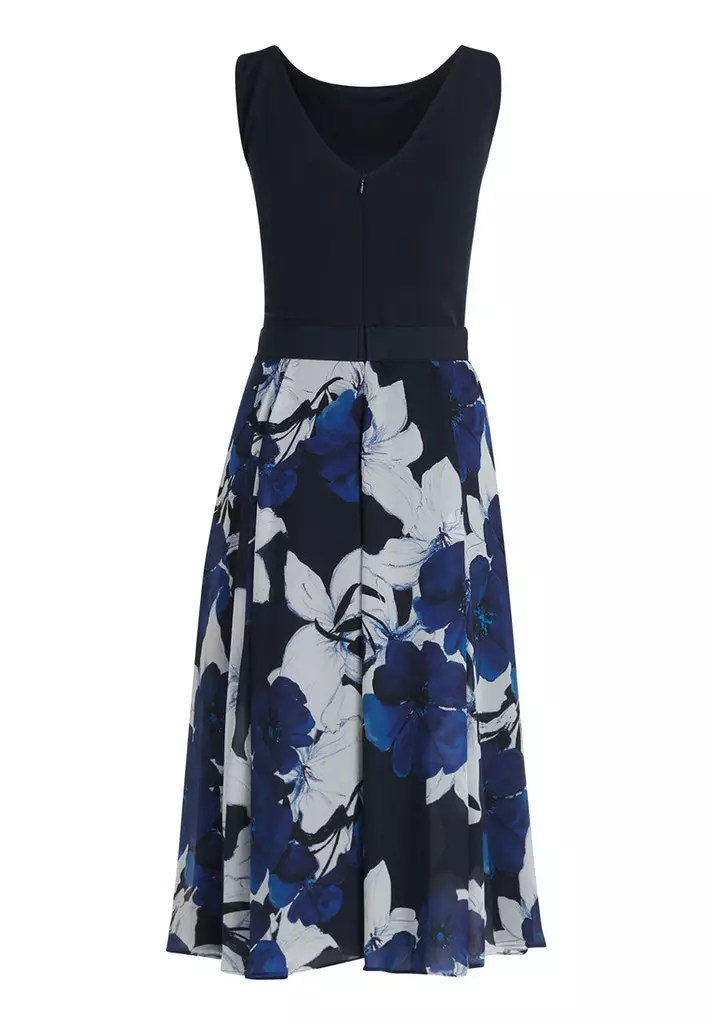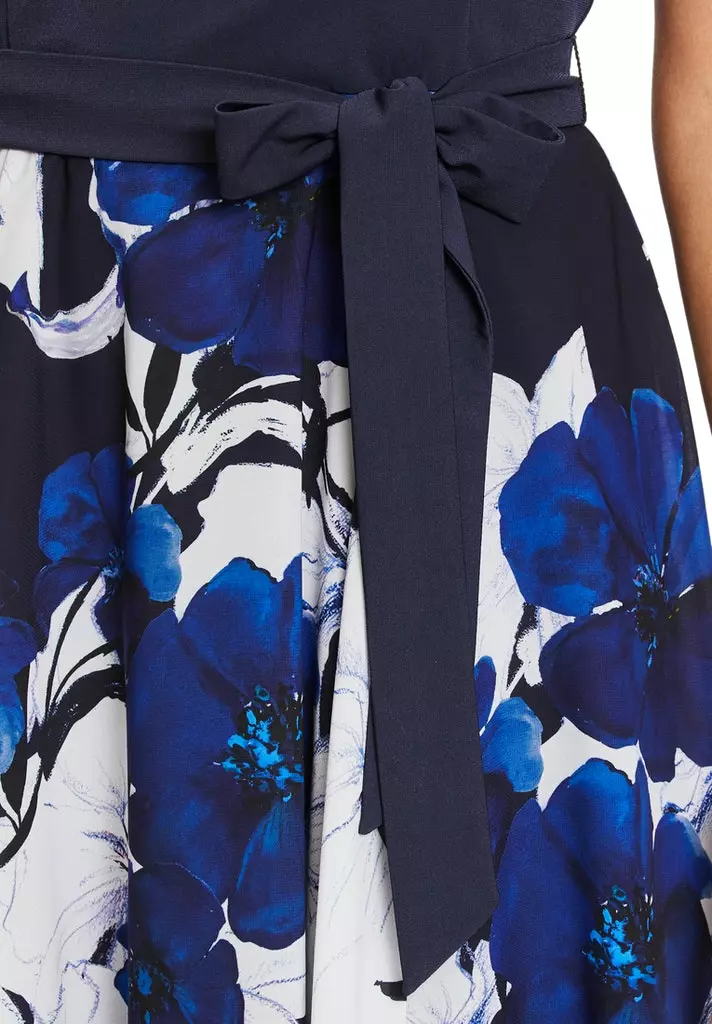 Midi jurk met prachtige bloemenprint in kobalt, navy en witte kleurencombinatie. De jurk valt getailleerd in de top en loopt zwierig uit vanuit de taille. De jurk heeft een ritssluiting aan de achterzijde, een ronde halslijn en is mouwloos. In de taille zit een mooi taillekoord.