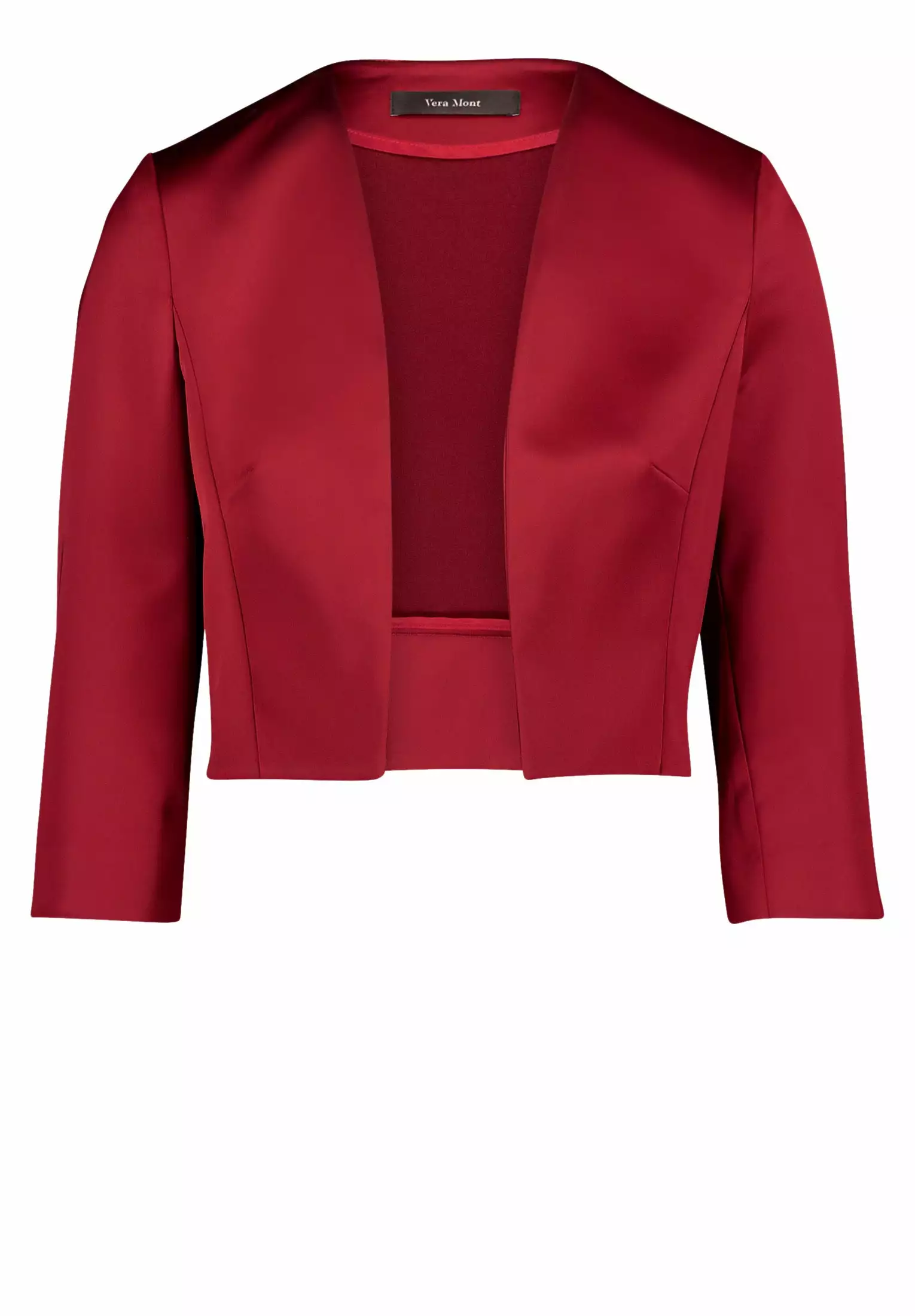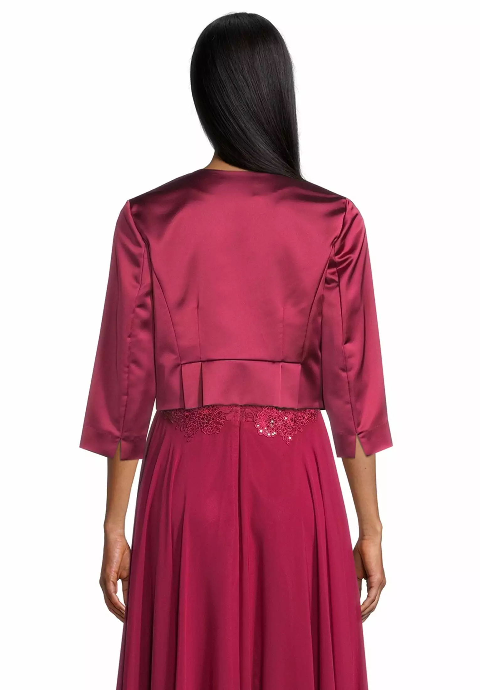 Satijnen bolero die je tot in de taille valt en precies de juiste lengte heeft om de jurk nog goed uit te laten komen en tevens je taille te benadrukken. De mouwen zijn 3/4 en de bolero heeft een v-hals.