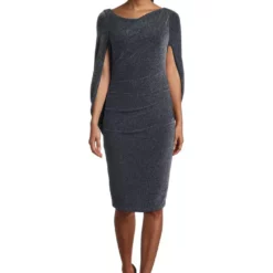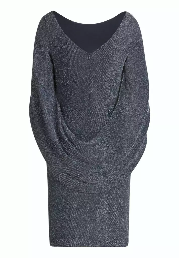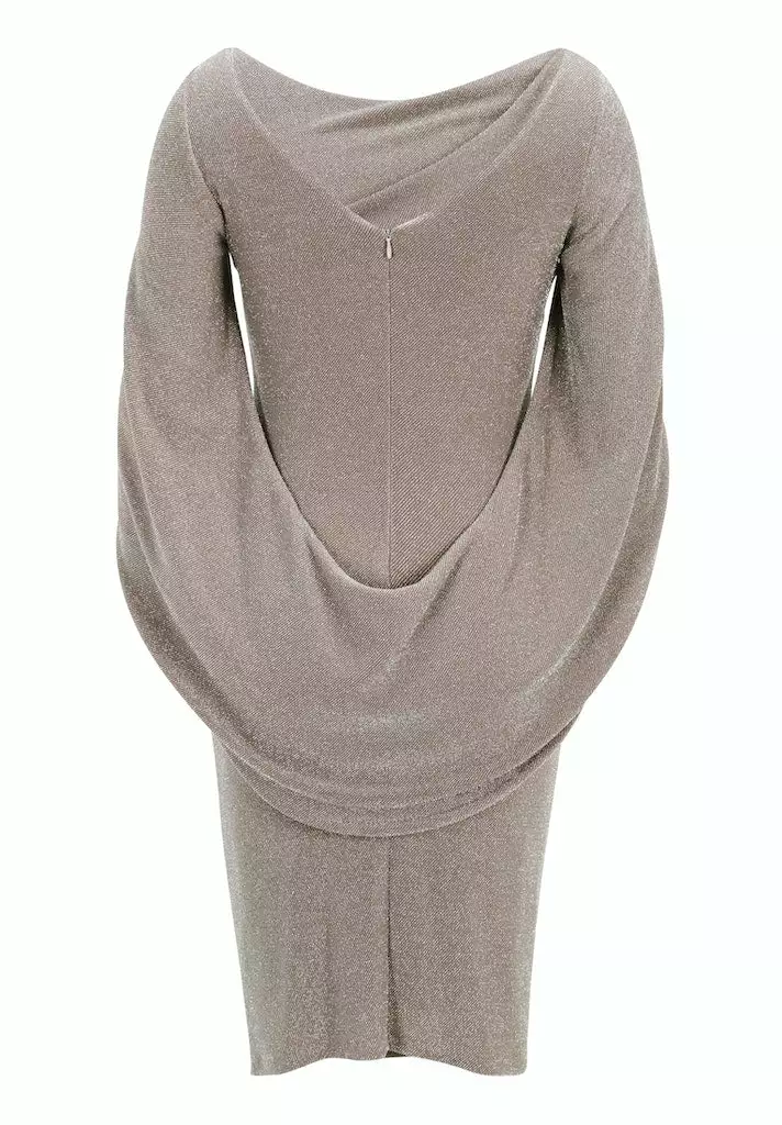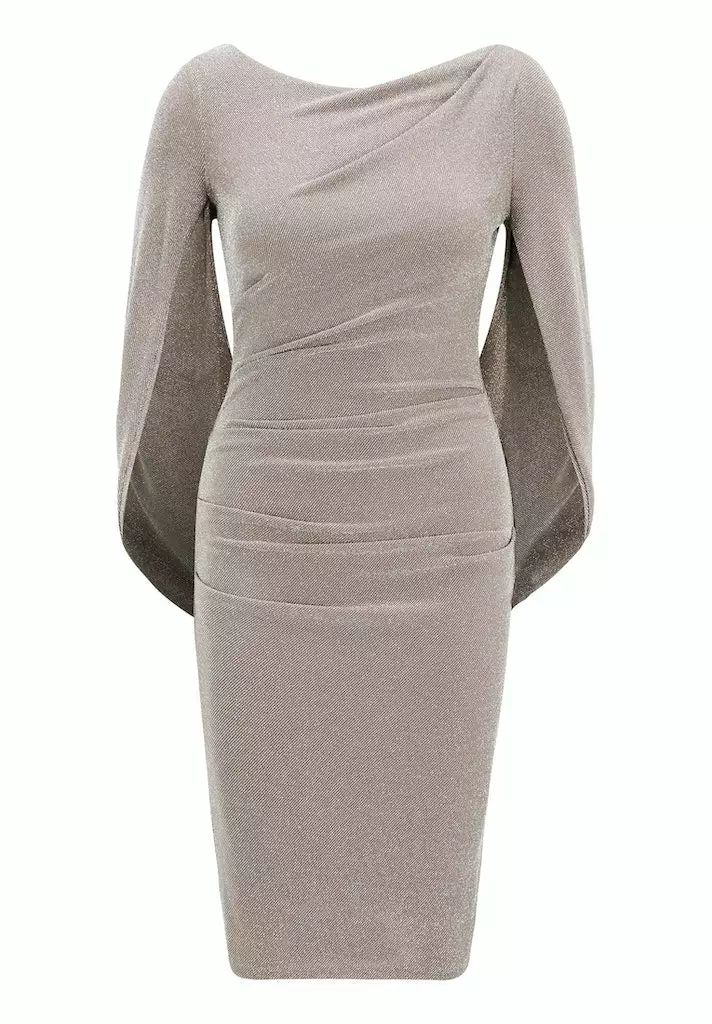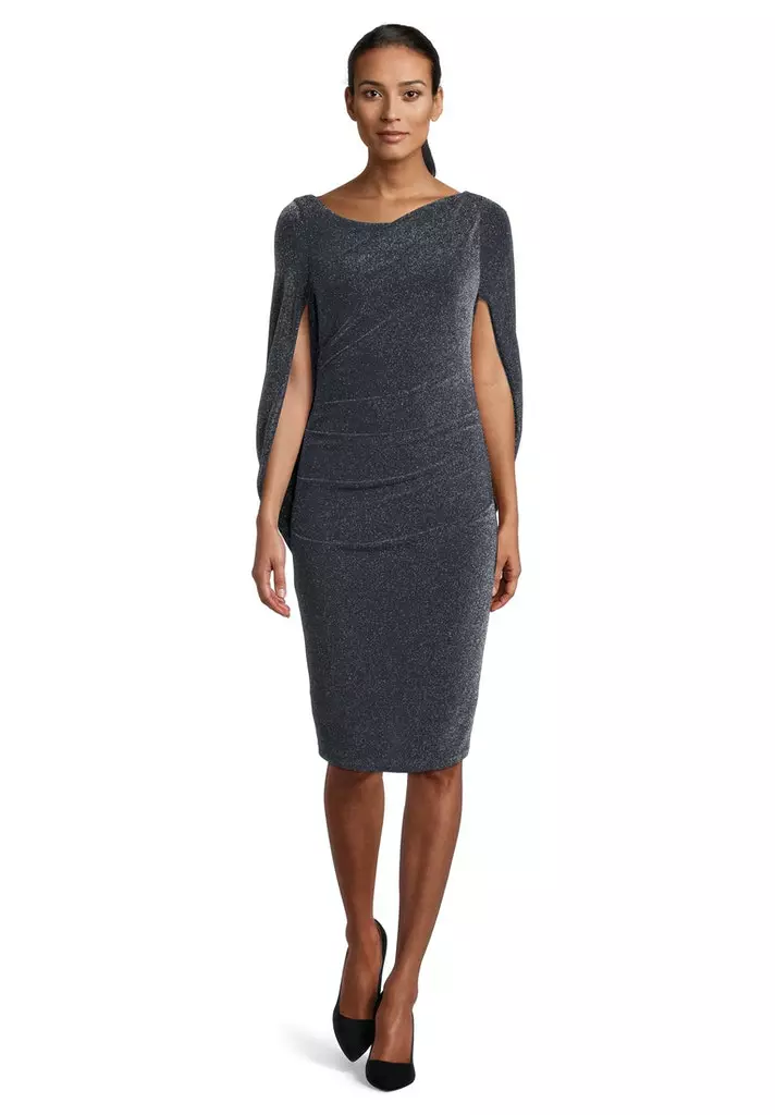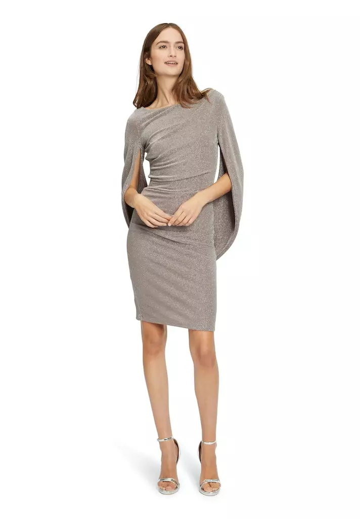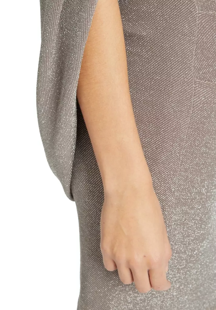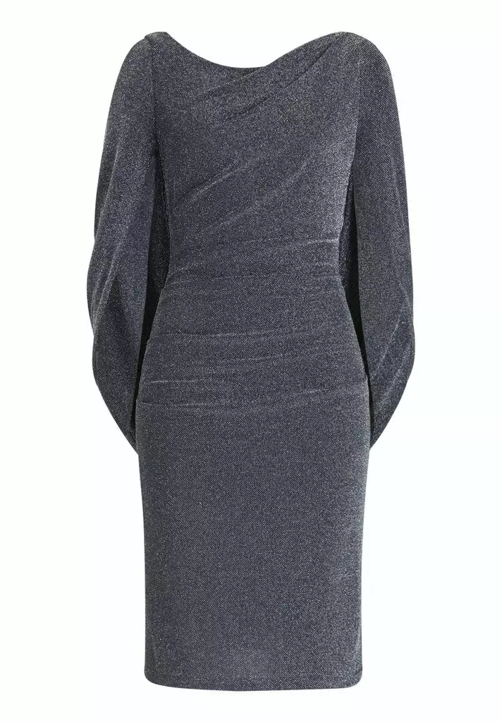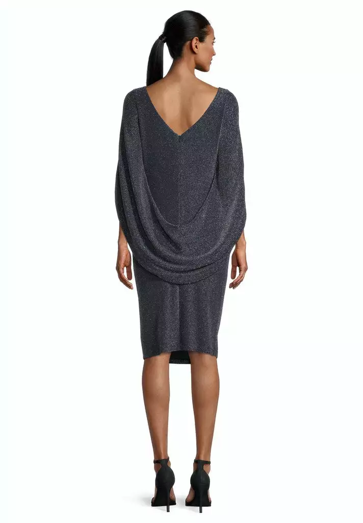 Cocktail jurk met fijne glitter in de stof waardoor deze extra feestelijk oogt. De jurk rekt mee, heeft een korte mouw die doorloopt over de achterkant van de jurk.