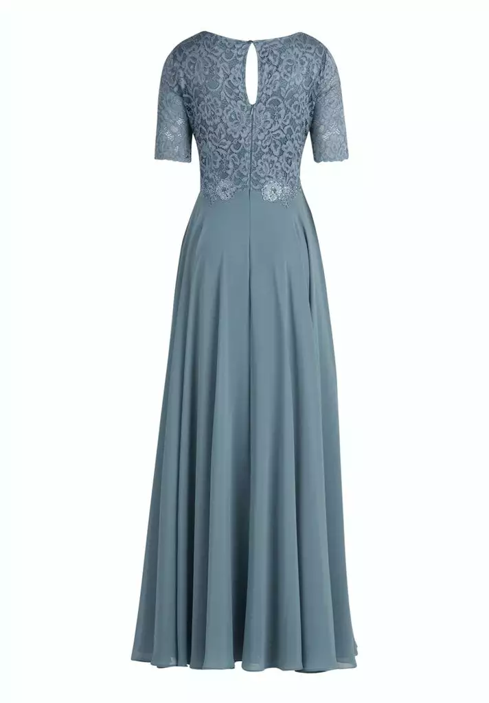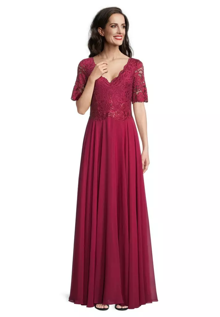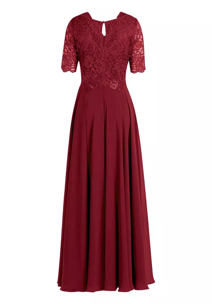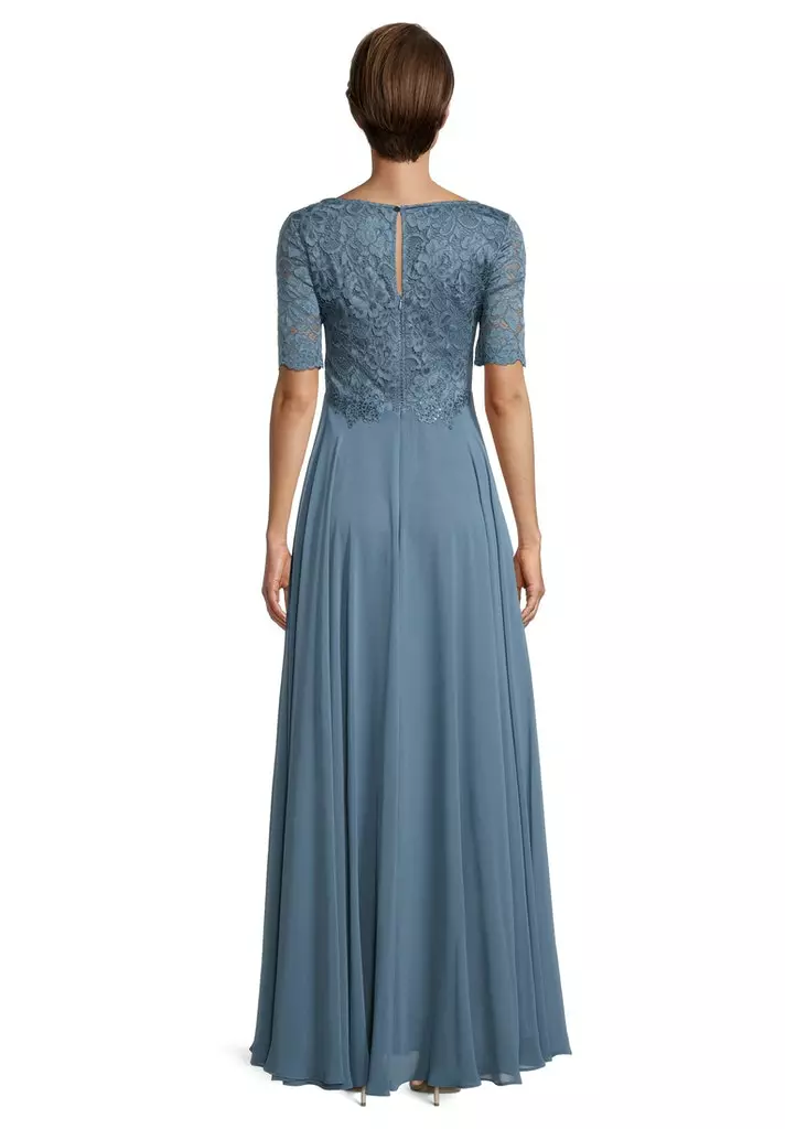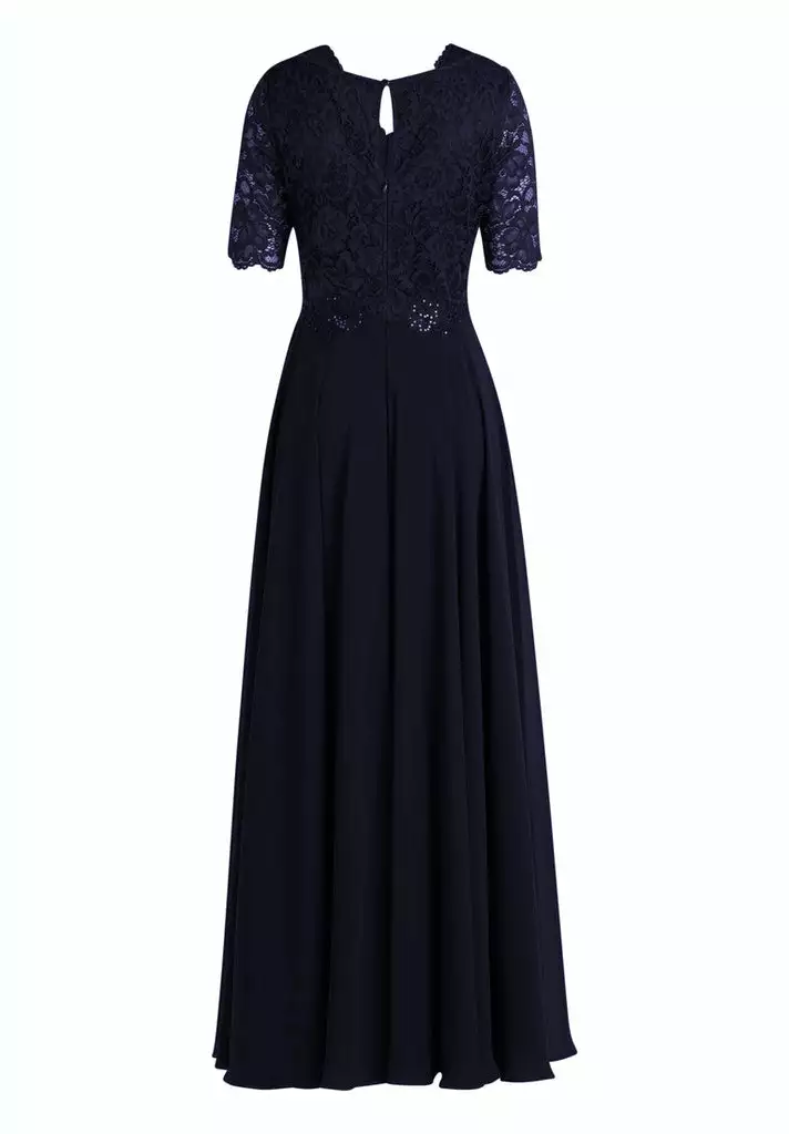Avondjurk met korte mouw en v-hals halslijn. Het topgedeelte is gemaakt van kant en het rokgedeelte van chiffon.