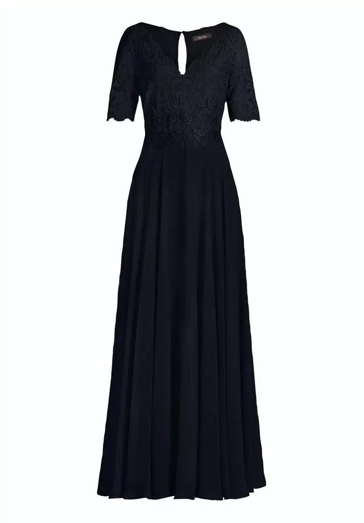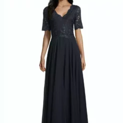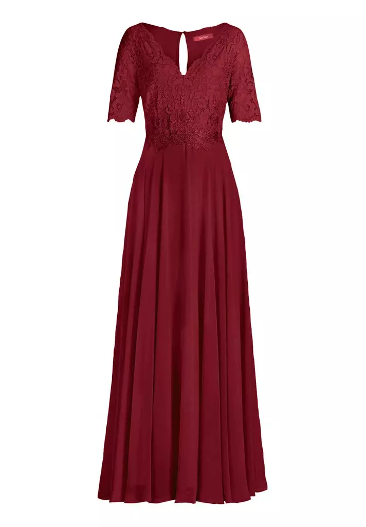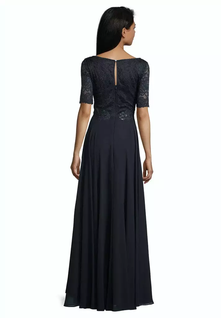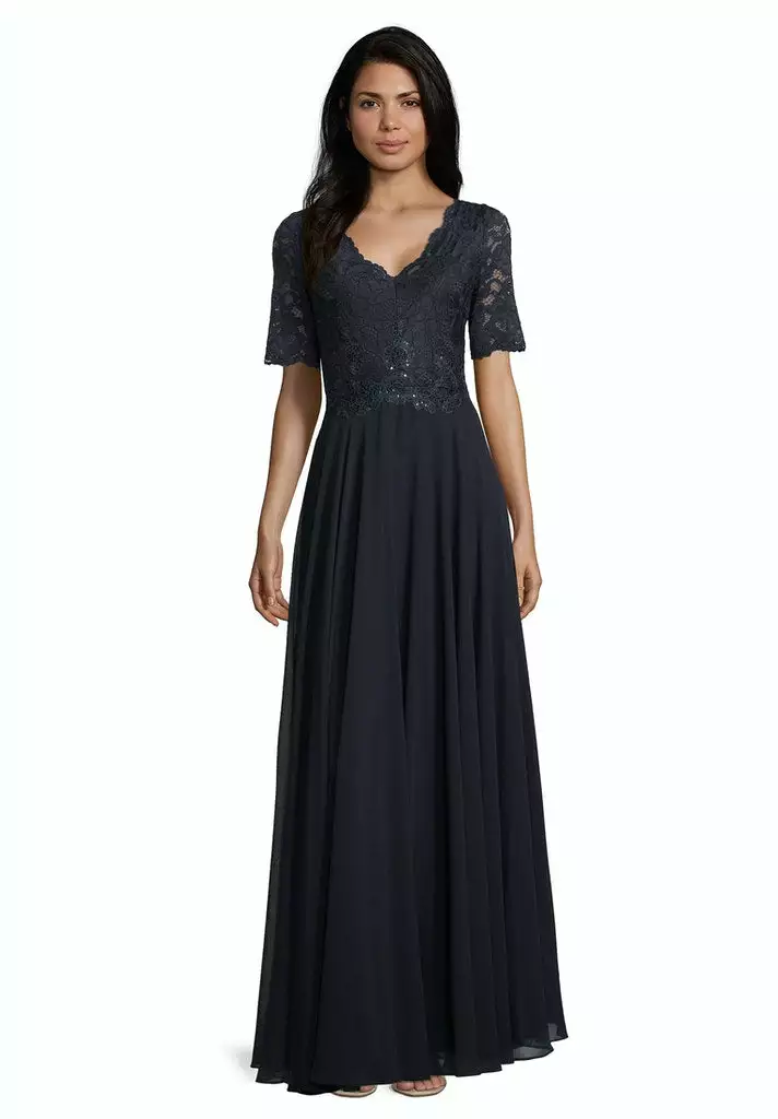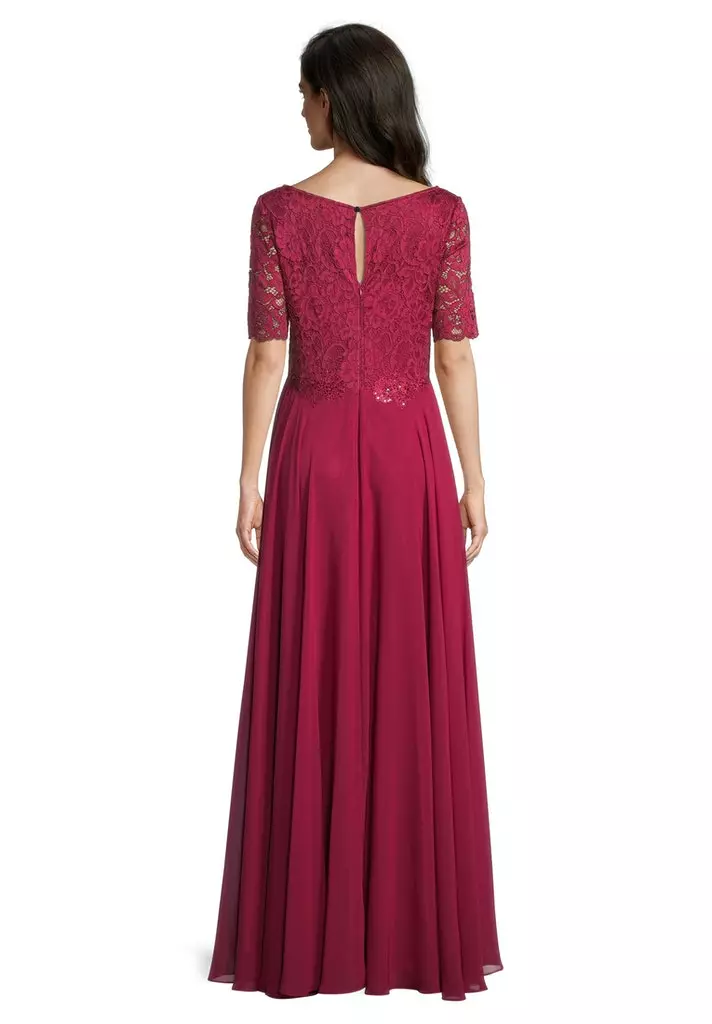 Avondjurk met korte mouw en v-hals halslijn. Het topgedeelte is gemaakt van kant en het rokgedeelte van chiffon.